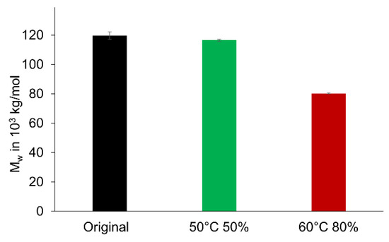 A device by Shimadzu Deutschland GmbH (Duisburg, Germany) with a column-set consisting of one precolumn (SDV 5 µm 8 × 50 mm (PSS GmbH, Mainz, Germany) and two separation columns (SDV 1000 Å 5 µm 8 × 300 mm and SDV 100.000 Å 5 µm 8 × 300 mm, PSS GmbH, Mainz, Germany) was used for the measurements of the average molecular weight of PLA before and after treatment for selected samples. PLA fibers were dissolved in chloroform (HPLC grade) to achieve a nominal concentration of 2.5 mL/mg. Chloroform was used as an eluent at a flow rate of 1 mL/min. Poly(methyl methacrylate) standards were used for the calibration.