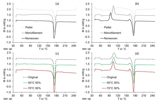 Puchalski et al. [27] used DSC along with other methods of structural and chemical analysis for the evaluation of molecular ordering and creation of meso and crystalline structures of PLA during the fabrication of spun-bonded nonwoven in the downstream pilot laboratory equipment. The increase in take-up velocity and calendaring temperatures well above Tg leads to formation of about 60% of ordered crystalline phase. However, it should be noted that an additional reduction in the initial molecular weight can occur during high-temperature processing as a result of the thermal degradation of PLA, reaching as much as 60% [40,50]. This effect is illustrated in Figure 3a,b which compares DSC curves of the original pellet material, monofilament and nonwoven fabric.