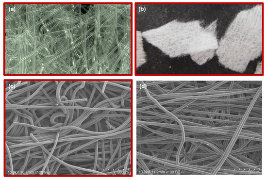 Exposure to extreme aging conditions of 80 °C and 80% RH leads to an extreme brittleness of the fabrics, so that the samples are not possible to handle. Figure 6a,b present optical images of the loose fabric, as well as REM images of the fibers after (Figure 6c) and before aging (Figure 6d). The latter sample reveals numerous broken fibers even on a small-sized area of the nonwoven.