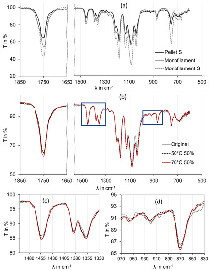 Figure 7b compares the spectra of nonwovens before and after artificial aging at mild and elevated temperatures. The close up areas of the most relevant areas of spectra (Figure 7c,d) reveal a weak trend of the degree of crystallinity increasing as the temperature of aging grows. The shape of the peak at 1750 cm−1 is not notably affected as a result of aging. Additionally, the bands at 921 and 957 cm−1 appear to be similar, indicating no significant structural changes.