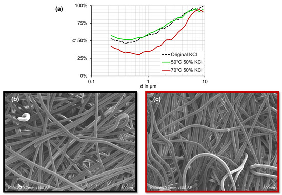 Figure 8 presents the separation efficiency of the untreated and of artificially aged nonwovens (as in Figure 5). Although the nonwoven architecture used was not optimized for use as a filter material, a good separation efficiency η is achieved for particles with dimensions above 3 µm. The sample, which as artificially aged prior to filter tests under mild conditions (50 °C, 50% RH), exhibited no reduction in the filter performance in comparison to the untreated sample (original). The sample aged at extreme conditions (70 °C, 50% RH) had a significantly lower filter performance in the whole studied range but shows no increase in the air pressure difference (~24 Pa for all three samples). This observation could, on the one hand, indicate a fast decrease in mechanical integrity as soon as the media are increasingly loaded with the particles and the pressure on individual fibers grows. We note that the visualization of fiber morphology in SEM images (Figure 7b,c) does not reveal appearance of broken fibers. On the other hand, the separation efficiency in sub-micrometer range depends on the surface properties of the fibers. Therefore, additional tests are required to characterize a possible loss in the surface hydrophobicity or in electret function. Generally, the results of the filtration tests are in good agreement with the stability diagram in Figure 5.
