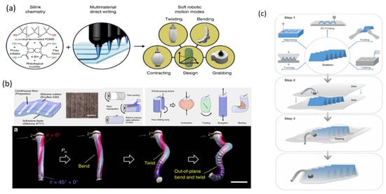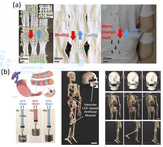 High thermal expansion materials include low-density polyethylene (500 ppm/K) [48], polydimethylsiloxane (~300 ppm/K) [49], biaxial oriented polypropylene (~120 ppm/K) [50], etc., while textile cellulose and protein fibers have a high expansion in diameter when wet, such as cotton (7–20%), jute (20–21%), wool (14–17%), and silk (16–19%) [51]. These materials’ expansion behavior has been utilized to fabricate various tensile, bending, and torsional actuators for wearable applications, as shown in Figure 5.