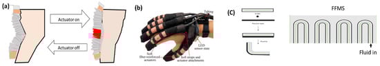 Applications of pneumatic/hydraulic actuators as wearable devices. (a) Pneumatic based wearable knee suit [19]. (b) A hydraulic soft glove for combined assistance and at-home rehabilitation [21]. Copyright 2015, Elsevier. (c) Fluidic Fabric Muscle Sheets (FFMS) [22].