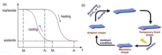Shape memory effect (SME) is a phenomenon in which a material recovers to its original size and shape when heated above a certain characteristic transformation temperature [27]. The two most prevalent shape-memory materials are shape memory alloys (SMAs) and shape memory polymers (SMPs).
