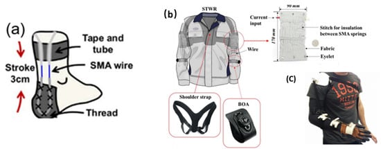 Soft wearable robots using SMA wires. (a) A soft wearable robot using a SMA wire to assist ankle plantar flexion [42]. Copyright 2020, IOP Publishing Ltd. (b) An STWR to assist the muscular strength of wearers [44]. Copyright, 2019, Springer Nature. (c) A medical rehabilitation exoskeleton for proper patient elbow joint articulation [45] Copyright 2017, Dorin Copaci et al.