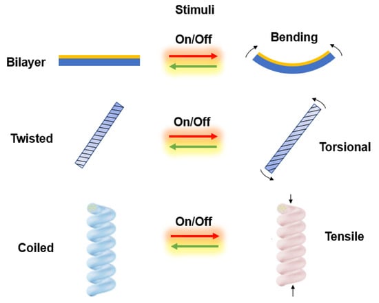 Bimorph structure is a widely adopted strategy to generate bending motion via asymmetric deformation of the two layers, an active layer that contracts or expands by an external stimulation and a passive layer that remains intact. The interfacial stress generated between the two layers due to the volume mismatch leads to bending deformations. There are many examples of bending actuators in the film form, such as LDPE/PVC film [48], poly(vinyl alcohol-co-ethylene) (EVOH)/cellulose film [52]. Alternatively, asymmetric exposure of water vapors or heat to the thin film of moisture or heat responsive materials can also achieve the bending motions, but the bending performance is thickness sensitive. Examples includes microfibrillated cellulose film [53] and nylon beam coated with thermally conductive graphene flakes [54]. Some bimorph fibers have also been developed. Cyclic olefin copolymer elastomer/HDPE fiber was developed by using a fiber-drawing technique, and can lift more than 650 times its own weight at a low temperature [55]. A moisture trigged acetate-based conjugate fiber (VentcoolTM) was created by the Kaiteki company to automatically adjust ventilation of clothing [56].