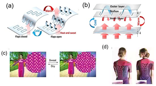 Moisture and heat responsive smart textiles. (a) Nafion sheet schematics with openable flaps mimicking thermo-adaptive functionality of human skin [70]. Copyright 2017, Springer Nature. (b) The schematic of the thickness reversible structure using nafion as a thermally adaptive interlayer [70]. Copyright 2017, Springer Nature. (c) Schematic diagram of moisture sensitive clothing changing sleeve and pant length before and after exercise [57] Copyright 2017, Wiley-VCH. (d) Running suit prototype with ventilation flaps based on the moisture sensitive biohybrid two-layer film [72]. Copyright 2017, the authors, published by AAAS.