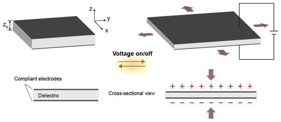 Dielectric elastomer actuators (DEAs) are electronic electroactive polymers that enable electromechanical transduction at effective electrical fields, transferring electrical energy into mechanical work [7,73]. The working principle of a DEA is based on the basic configuration that two compliant electrodes are coated on each side of a thin polymer film to form a deformable capacitor (Figure 7). According to the elastic electrostatic model first established by Pelrine et al. [74,75], due to the inherent volume incompressibility, when an electrical field is applied perpendicularly to the plane of the two electrodes, two mechanisms are generally induced: the attractive electrostatic forces among opposite charges on each electrode cause the polymer film to compress in thickness and the repulsive electrostatic forces among like charges over the same electrode render further expansion in area, reducing the electrical energy [7,74]. For an ideal elastic model, electrostatic energy is equally converted to mechanical energy through lateral and transverse displacement [74]. The capacitance (C) of the dielectric film is
