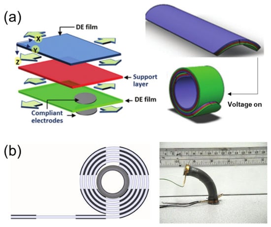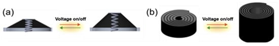 Schematics of expansion DEAs. (a) Cone-shape structure [78]. (b) Rolled structure [78] Reproduced under the terms and conditions of the Creative Commons Attribution (CC BY) license (http://creativecommons.org/licenses/by/4.0/). Copyright 2020, The authors. Licensee MDPI, Basel.