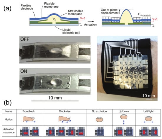 - Lee, H.S.; Phung, H.; Lee, D.-H.; Kim, U.K.; Nguyen, C.T.; Moon, H.; Koo, J.C.; Nam, J.-D.; Choi, H.R. Design analysis and fabrication of arrayed tactile display based on dielectric elastomer actuator. Sens. Actuators A Phys. 2014, 205, 191–198. [Google Scholar] [CrossRef]