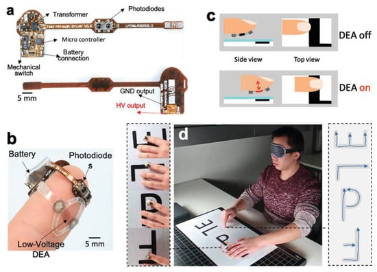 Schematics and prototypes of wearable fingertip tactile DEAs. (a) The wireless driver circuit. (b) Untethered “feel-through” haptic device on a fingertip. (c) Operating principle of Untethered FT-DEA. (d) The blindfolded user correctly identifies randomly rotated and placed letters E, P, F, and L [96]. Copyright 2020, Wiley-VCH.