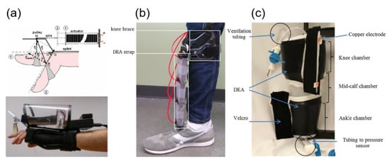 Apart from the aforementioned properties, the muscle-like and variable-stiffness behavior of DEAs without bulkiness and noise makes it favorable for wearable rehabilitation devices. Examples include active hand splints for hand/finger rehabilitation (Figure 13a) [102], ankle-foot orthosis (AFO) remedying foot drop (ankle dorsiflexion inability) (Figure 13b) [103] and compression bandages targeting the disorder of venous systems (Figure 13c) [104]. Compared to conventional passive ones with elastic bands, dynamic hand splints with folded contractile silicone DEAs enable flexible modulation of mechanical compliance and finger exercise by varying the driving voltage [102]. AFO designed with DEAs allows for lighter weight and less energy consumption with a charge recovery power system, and at the same time does not hinder plantarflexion function [104].