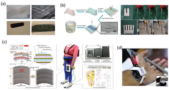 Applications of wearable actuators mainly include wearable robotics, haptic devices, and smart textiles. Wearable robotics have been proven valuable in rehabilitation, body assistance, and/or virtual reality [3]. These applications cover systems of various sizes, from millimeter-scale biorobots to large deployable structures. Haptic devices allow the intent recognition and information transmission through the interface link between the device and the skin. They contain flexible tactile actuators that can transfer the signal through vibration or morphological change [4]. Smart textiles are textiles that can interact with the environment or respond to stimuli [5,6]. Examples of smart textile applications include electrocardiography-T-shirts/wristbands, electroencephalography caps and photovoltaic curtains [1].