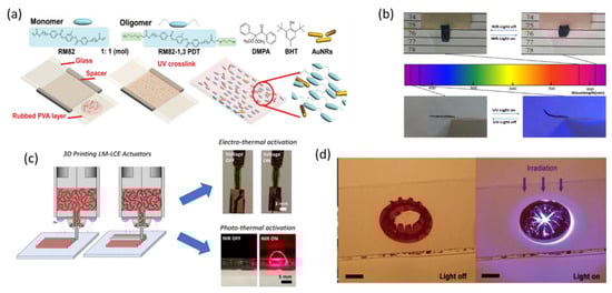 - Wang, Y.C.; Dang, A.L.; Zhang, Z.F.; Yin, R.; Gao, Y.C.; Feng, L.; Yang, S. Repeatable and Reprogrammable Shape Morphing from Photoresponsive Gold Nanorod/Liquid Crystal Elastomers. Adv. Mater. 2020, 32, 2004270. [Google Scholar] [CrossRef] [PubMed]