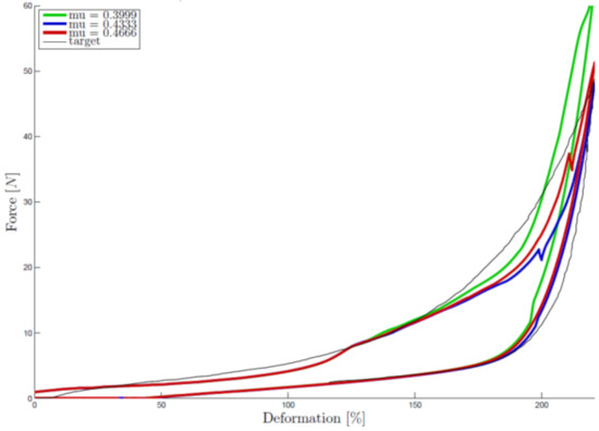 Figure 2 below, the algorithm is applied to a weft knitted textile sheet to simulate the loading-unloading under unit-axial tension. The simulation results are compared with experimental measurements. The simulation is performed with varying friction coefficient μ.