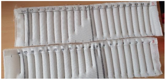 Figure 10 shows the process of the seam insertion under given machine parameters, reasoning the seam-yarn pre-stress. Using the known pre-strain in the seam, it was placed in the digitalized fabric; see