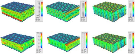 www.geodict.com). However, the fluid–solid interaction was not considered there. The spacer fabric was assumed to be rigid, and the flow through the uncompressed fabric was simulated first (the first row in