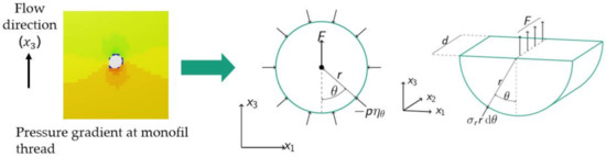 As stated, the correct modeling is a main and delicate question. Exactly as in the previous sections, the relation between the textile thickness and applied forces will determine if the textile will behave as a stretchable membrane or as a bending-resistant plate or shell. In fact, here, in the fluid–solid interaction, the relation between the yarn’s stiffness and the fluid viscosity plays a crucial role. If their relation is proportional to the yarn’s thickness, the frictional forces at the monofilaments will rise their tension, and they all together will work like an extensional membrane. However, if the monofilaments are much stiffer than the fluid, as in the case of the spacer fabric infiltrated by water (this corresponds to the cubic yarn-thickness in their relation), the forest of monofilaments will bend and the curvature of the monofilaments will be proportional to the pressure jump in a non-local (such as memory or relaxation) setting [