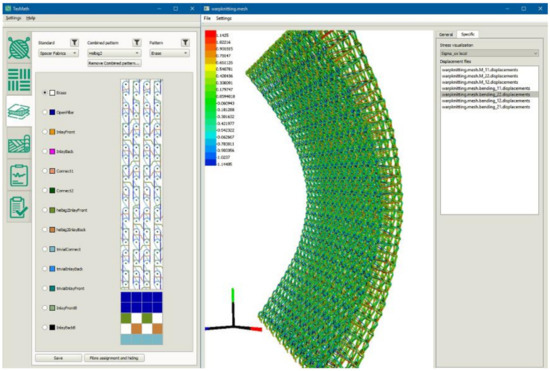 Figure 9), the spacer fabric was digitalized in the computer in the stage as it comes from the machine. Afterwards, it was virtually extended in the plane and then compressed. All the performed deformations were carried out within the TexMath module FiberFEM for mechanical simulation of textiles. At the end of the mentioned steps, the yarns are already pre-strained. This is the preparation step for the insertion of stitches in the 3D structures.