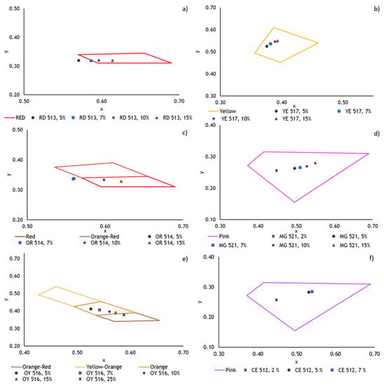 Chromaticity coordinates obtained for different pigments and additivation percentage: (a) RD 513 pigment (5, 7, 10 and 15%); (b) YE 517 pigment (5, 7, 10 and 15%); (c) OR 514 pigment (5, 7, 10 and 15%); (d) MG 521 pigment (2, 5, 7, 10 and 15%); (e) OY 516 pigment (5, 7, 10, 15 and 25%); (f) CE 512 pigment (2, 5 and 7%).