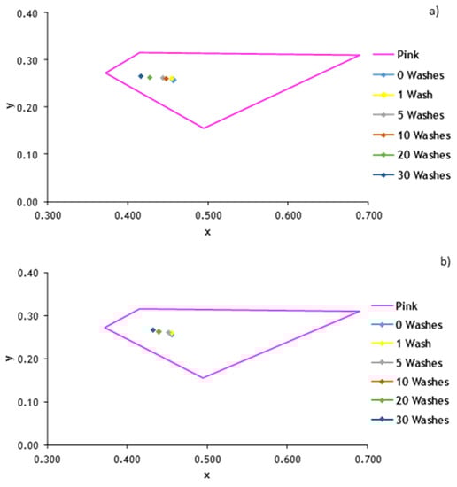 Regarding the samples of knitted fabric with 2% MG 521 pigment, with and without a cross-linker agent, Figure 4 shows chromaticity coordinate results obtained for both samples. The presence of the cross-linker agent CL1 slightly improves fastness to washing.