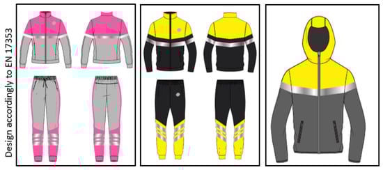 A sportswear collection with the fluorescent and phosphorescent materials developed was designed, fulfilling area and design required by EN17353 for type AB equipment which includes protections for daylight, twilight, and dark conditions, Figure 7. On the left side, an ensemble for women is presented using MG 521 fluorescent pigment and on the right side is an ensemble for man using YE 517 fluorescent pigment. Both ensembles present details with a P2 phosphorescent pigment.