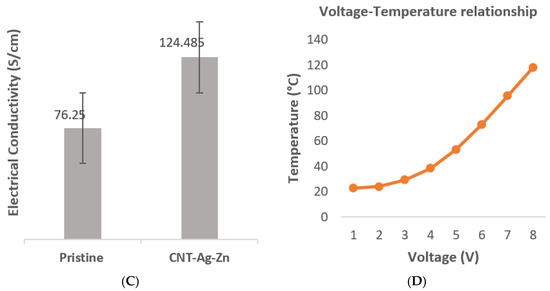 The CNTH material was synthesized by incorporating silver and zinc nanoparticles in a high-temperature gas phase pyrolysis synthesis process. The SEM image of the CNTH material with silver and zinc nanoparticles is shown in Figure 2A. To confirm the presence of the nanoparticles in the CNTH sheet, EDX was performed on different positions. The EDX in Figure 2B shows the concentration for silver and zinc nanoparticles. The electrical conductivity of the pristine CNT and CNTH material was measured using a four-point probe method. As we can see in Figure 2C, the CNTH material has better electrical conductivity as compared to the pristine CNT. The increase in conductivity is due to the presence of silver and zinc nanoparticles in the hybrid material. The voltage–temperature relationship for the hybrid material was investigated (Figure 2D). The CNTH material showed good heating performance and reached up to 120 °C at a very low voltage. This flexible, lightweight CNTH material with good electrical conductivity and heating performance can be used in wearables’ applications.