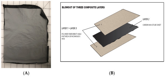 The integration of CNTs in composite and blended materials offers many advantages due to their combination of good strength and modulus combined with low density [38]. Several methods of combining CNTH sheet with conventional textiles have been tested as part of this study. These methods include stitching (quilting/embroidery), adhesives (liquid, spray, powder, or heat activated), coating/lamination (wet treatment) as shown in Figure 3A, and heat fusing (dry or steam embossing or calendaring) as shown in Figure 3B. Each method offers its own set of benefits and drawbacks, which are directly dependent upon the fabric and CNTH properties, and appropriateness for the end use.