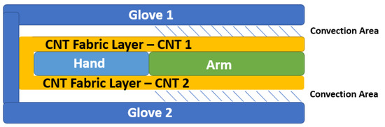 Simulation of an AT glove for FFs—Design of the glove. Glove 1 is the top outer layer of the glove, glove 2 is the bottom outer layer of the glove. CNT 1 is the top inner layer of the glove. CNT 2 is the bottom inner layer of the glove. The convection area is the area in which air flow from the air pump cools the glove. The thermal properties of the hand and arm are modeled in the simulation. A cold area to provide cooled air is not shown. The drawing is not to scale.