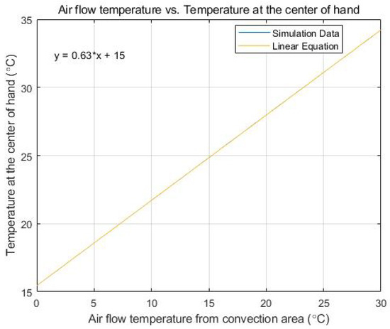 The simulation model can produce a range of results depending on the various input parameters. The temperature at the center of the hand can be estimated in this example under various environmental conditions, such as varied working temperatures. The air flow velocity and the temperature of the convection area (which defines the air flow temperature goes into the AT glove) are the two primary parameters that impact the temperature at the middle of the hand. The airflow velocity can be adjusted using a commercial fan integrated into the glove, and the temperature of the convection area (cooler area) can be controlled using an ice pack to create a low-temperature zone. Then, the low-temperature air flow can remove a significant quantity of heat that enters the glove from the high-temperature surroundings. The relationship between the temperature of the convection area and the temperature at the center of the hand is depicted in Figure 5. The ambient temperature is 60 °C, and the air flow velocity is 1 m/s in this scenario. The curve fitting equation y = 0.63x + 15 illustrates the accurate relationship between the convection area temperature and the temperature at the center of hand.