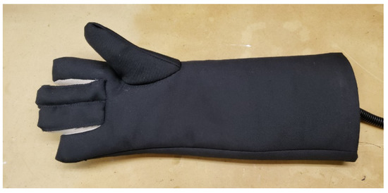 General construction of a prototype Active Textile glove with CNT inner liner. The glove has an outer protective layer, CNT center layer, and soft inner layer against the skin. The tube at the cuff is for air flow into the glove.