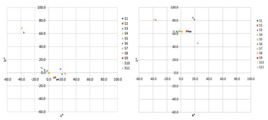 Distribution of 11 sample pairs on the a*b* plane (left) and L*a* (right) plane under standard D65/2°.