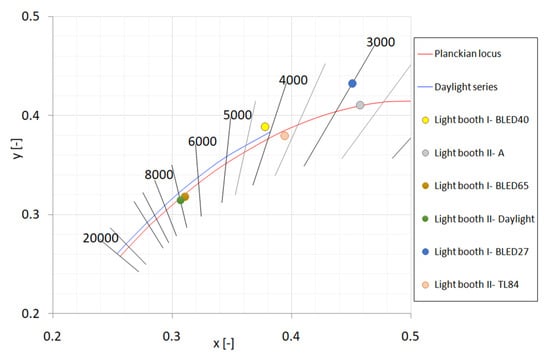 Table 1 summarizes measurements of chromaticity, correlated color temperature (CCT), and luminance level. From Table 1 and Figure 3, the light sources of viewing booth II are located on or close to the Planckian locus, whereas for booth I, BLED40 and BLED27 are situated even outside the daylight series. From Table 1 and Figure 3, the light sources of viewing booth II are on or near Planckian locus, while BLED40 and BLED27 of booth I are even outside the daylight series. Figure 2 is showing that both viewing booths have a relatively different spectral quality of the light sources.