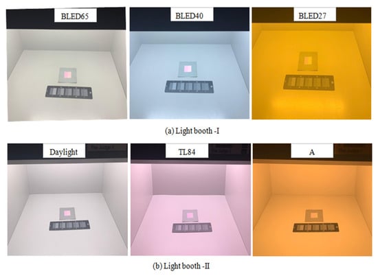 To optimally meet the application and operational requirements, there are many lighting booths on the market that are equipped with many standard light sources (the illuminant) as defined by the Commission Internationale de l’Eclairage (CIE) [,]. The use of high-performance light booths enables reliable color assessment and helps identify color inconsistencies, metameric effects, and the influence of brighteners. However, the performance of different light and lighting booths with the same specification can vary greatly []. CIE guidelines describe several parameters including lighting and sample presentation methods [] for visual color assessment. Different sample presentation methods may introduce variations in the measurement [], but if the same sample presentation methods are used, variations may be attributed to the light booth conditions such as the actual color temperature of the light, light intensity, lamp operation time, etc. A studied revealed that the luminance level in several light booths varied from 100 to >1000 cd/m2 []. There are studies that show how correlated color temperature and illuminance affect color perception [,,,] and users’ feeling [,,,].