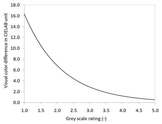 This exponential Equation (3) is used to predict the CIELAB color difference from the gray-scale rating, as shown in Figure 5.