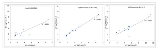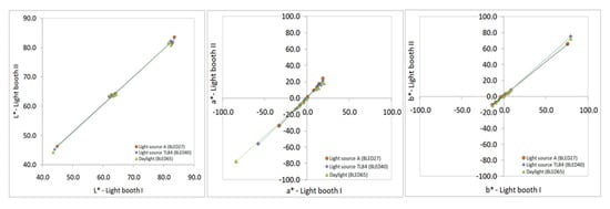 There were significant differences between the two booths for all mean CIELAB values for the test metameric pairs, as shown in Table 2. All observed correlations, which are shown in Figure 6, agree with the hypothesis that both light booths gave the same values up to a linear transformation.