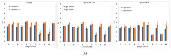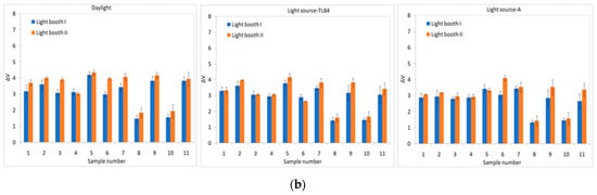Figure 7a,b show the visual color difference among samples with standard deviation bars and standard error of the mean (SEM) bars of two light booths. In the figure, the vertical lines denote standard deviation and standard error of the mean (SEM). It also shows that the visual evaluation of the tested sample pairs was consistent.