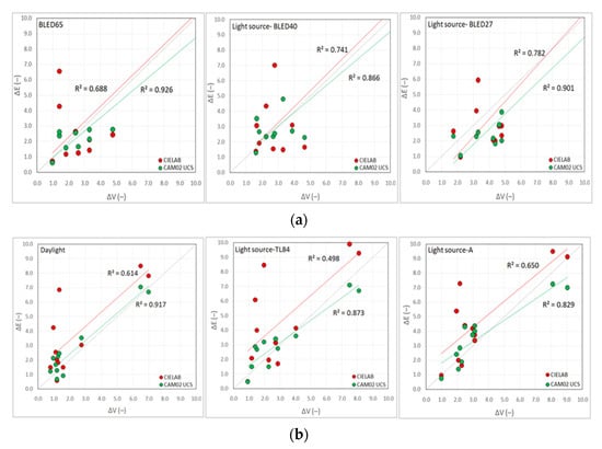 Correlation between visual and formula-based color difference of different light sources. In the figure, BLED65, BLED40, and BLED27 represent the light sources with nominal CCT 6500 K, 4000 K, and 2700 K, respectively for light booth I; and Daylight (Simulator D65), TL84 (Tri-band fluorescent tube), and A (Tungsten lamp) represent the light sources with nominal CCT 6500 K, 4000 K, and 2700 K respectively for light booth II. (a) Light booth I, (b) Light booth II.