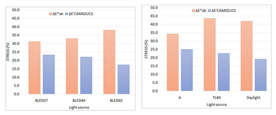 The reliability of the color difference assessment was evaluated by inter-observer variability in terms of STRESS value, performance factor (PF/3), and correlation coefficient (COQ), as shown in Figure 10 and Table 3. According to our results, all three metrics such as STRESS, PF/3, and COQ showed better results for the CAM02-UCS model than the CIELAB among all light sources. The reason for this could be that the appearance-based models predict well the role of illuminations in perceived color differences [].