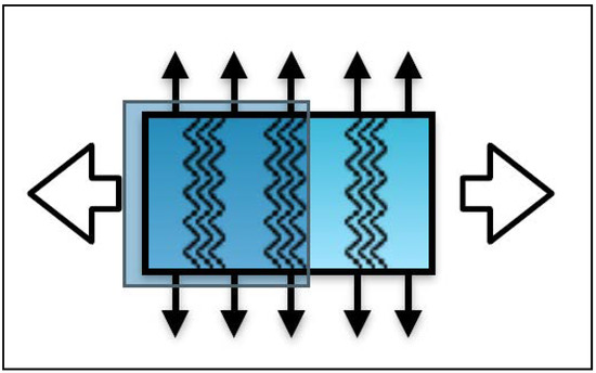 Auxetic fabric is developed with foldable strips created in a zig-zag way in a vertical (warp) direction. It is based on the principle that when the fabric is stretched unfolding of the folds takes place, leading to an increase in transverse dimensions. Foldable geometry was realized into the fabric using a combination of loose and tight weaves to create differential shrinkage [14,15,16,17]. The unit cell of interlacement pattern of two single-layered fabrics based on parallel in-phase zigzag alternately folded stripes running along the warp direction as shown in Figure 6.