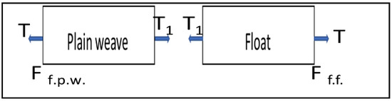 In the unit cell of the design, there are 18 warp and 17 weft yarns. Considering each pick, there are two portions of different weave patterns, for example, the first weft is interlaced with nine warp yarns in a plain weave pattern, and the rest is with 1-up-4-down twill (float). The weft has two yarns that are elastic and stiffer yarn. The elastic yarn will be responsible for the extension in the floating part initially. The pull-out force of yarn from a plain-woven fabric is much more compared to that of 1 up 4 down twill weaves, as the interlacements in the case of plain weave are more. The stiffer weft yarn would require force to overcome the friction resistance. The stress at both sides of the fabric is equal and varying as the rate of displacement of the ends of the fabric is constant. Solving for the first pick, there are two segments—plain weave and float—the plain weave is toward the left side of the line of center. The force on both sides (connecting point) of the portion is different due to the non-symmetry of the structure. The force acting on the right side of the plain weave part would be more than on the left side. This would be balanced by the frictional force at each contact, which would accumulate in one direction due to differences in the end forces. The frictional force at each contact point in plain weave and float is given by Pan [50] as shown in Equations (1)–(3).