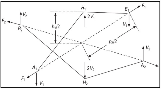 Saw tooth model for plain weave. (A1, A2, B1, B2: are nodal points of the saw tooth model, H1, H2: are crimp amplitudes in X and Y axes, h1/2: crimp height from crossover point, F1, F2: Total force along the saw tooth axes, p2/2: half wavelength, V1, V2: inter yarn pressure).
