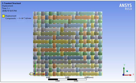 FEM: The prepared unit cell is imported to Ansys Workbench as a Stereo Lithography file to FEM Modeler to generate the initial geometry. Then these data are transferred to the transient structural feature. Then the type of material is assigned to the yarns, that is, the weft yarns were kept elastic and warp yarns are kept non-elastic.