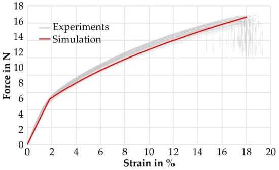 Figure 9 compares the force-strain behavior of experimental and numerical tensile tests. The simulation results were scaled by the ratio between the number of warp yarns in the simulation model and the number of warp yarns in the tested fabric. The structure-mechanical behavior of the fabrics was nonlinear. At the beginning of deformation, structural elongation occurred, which was associated with large strains at low forces. This behavior was followed by material elongation. Differences occurred between different textile architectures, while angle-through-thickness fabric exhibited the greatest structural elongation. There was very good agreement between results gained from simulation models and tensile tests in the elastic range. This suggests that models can be used as a basis for gradient fabrics.