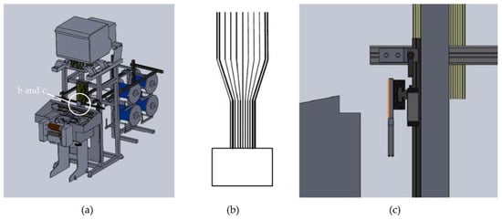 Developed additional ORW device: (a) integration into the weaving loom, (b) gantry system with ORW needles, (c) inserted open weaving reed with variable fabric width.