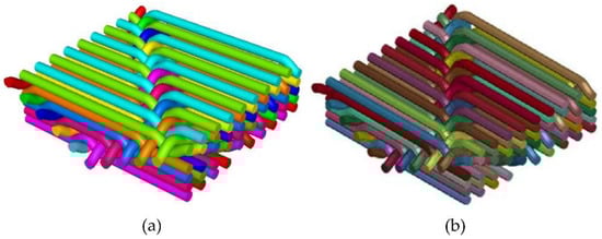 The basic weaves were transferred to numerical meso-scale models in LS-DYNA and subjected to virtual mechanical tests in order to predict mechanical tensile behavior. TexGen software [] was used to create a close to reality fabric geometry (Figure 4a). Fabrics were modelled with unit cell dimensions on the meso-scale, i.e., individual yarns were modelled. The generated fabric models were then converted into beam elements using a Python script, thus creating an FEM model for LS-DYNA (Figure 4b). The bending limp characteristic of silk yarn was taken into account by applying the digital element approach [,], in which the bending stiffness of the model yarn is neglected. The macro-scale fabric was assumed to consist of periodic multiples of the generated models. Therefore, the node pairs on opposite faces belonging to the same yarn were coupled using periodic boundary conditions to ensure the same displacement of each node pair.