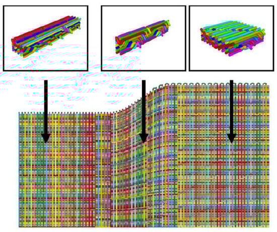 Model of fabric GW1 with gradient structure (one-fourth model), from left to right: layer-to-layer satin weave, layer-to-layer plain weave, angle-through-thickness weave.