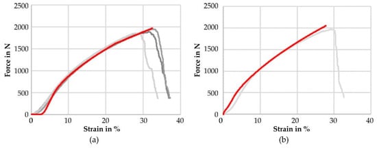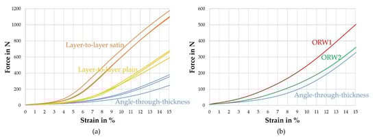 Force-strain behavior in the range up to 15% elongation of (a) multilayer weaves and (b) ORW weaves (mean) as measured from tensile tests.