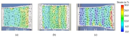 The optical evaluation of GW3 (Figure 7c) shows similar results as those of the tensile tests for GW2. The additional ORW yarns led to inhomogeneous elongations along the warp direction due to the stretched yarn layers on the backside of the fabric. The elongation ranges themselves differed only slightly from the results of GW1. Thus, in the zone of the angle-through-thickness weave (k3), there was a 45% higher elongation compared to the zone of the layer-to-layer plain weave (k2) and a 49% higher elongation compared to the layer-to-layer satin weave (k1). Again, the zones of layer-to-layer plain and satin weaves were close to each other.