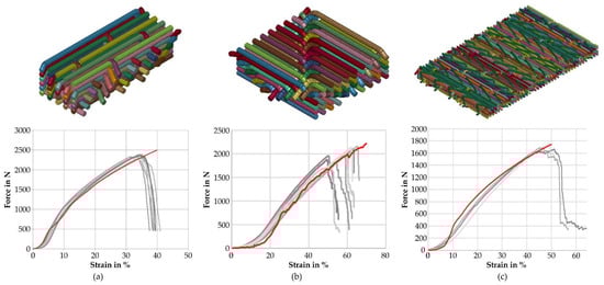 FEM models and force-strain-curves of selected weaving geometries (grey—experiments, red—simulation), (a) Layer-to-layer satin, (b) Angle-through-thickness, (c) ORW1.